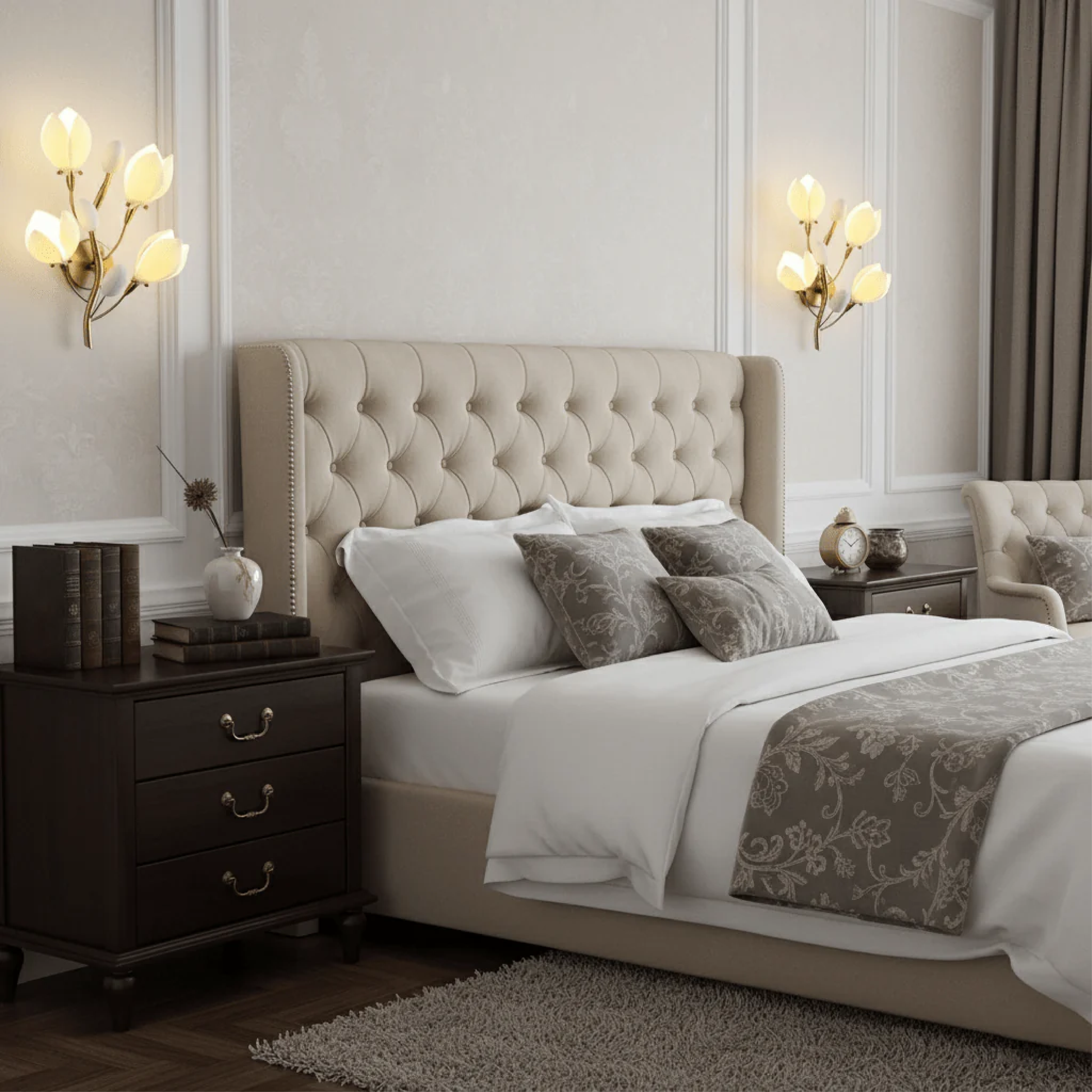 Esta lámpara de pared de inspiración floral captura la esencia de la naturaleza en una forma radiante. Los tallos curvados de metal se extienden con gracia desde una base central, soportando capullos de cerámica que brillan como pétalos besados por la luz del sol. Su mezcla de artesanía y forma natural aporta profundidad y calidez a espacios contemporáneos o clásicos por igual.